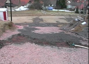 Der Fahrer entsorgte seine Reste verteilt auf ca. 10 m² unserer fertiggestellten Carportauffahrt. In einer Nacht- und Nebelaktion versuchten wir das Schlimmste zu verhindern und trugen, soweit dies noch möglich war, den teilweise schon trockenen Beton ab. Dadurch wurde die oberste Schicht der Auffahrt zwangsläufig in Mitleidenschaft gezogen. Wie auf den Fotos zu erkennen ist, wäre die eigentliche Funktion des Filters mit einer geschlossenen Betondecke wohl dahin - Beton läßt halt kein Wasser versickern.