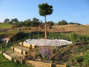 Nach langer Suche haben wir es endlich geschafft, weißen Splitt für unsere geplante Sitzecke im Garten zu organisieren - in einer Gegend, in der es hauptsächlich nur roten Sandstein oder schwarzes Gestein gibt, gar nicht so einfach! Um zumindest in diesem Bereich unkrautfrei zu sein, haben wir unter den Splitt unverrottbare Kunstfaserbahnen gelegt die wasserdurchlässig sind, aber kein Unkraut von unten durchlassen sollen.