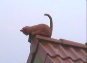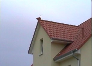 Also, diese zwei gehören schon länger zu uns. Der eigentliche Katzenzuwachs fand woanders statt.Vor ein paar Tagen erhielten wir endlich unsere Firstkatze, die wir im Internet sehr preiswert gefunden hatten. Kurz den Dachdecker auf der Baustelle nebenan angehauen, und für ein kleines Trinkgeld montierte er das Schmuckstück auf dem Giebel.