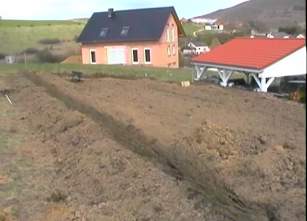 Vor vier Tagen ging es dann auch los: Mit Hilfe eines Landschaftsgärtners wurde nach unseren Wünschen und seinem Raten hin der Garten grob angelegt. Aufgrund der großen Ausgleichsfläche über unserem Garten, die sich ebenfalls in Hanglage befindet, waren wir aus Sicherheitsgründen "gezwungen" einen kleinen "Wall" gegen Oberflächenwasser, welches aufgrund der herrschenden Bodenverhältnisse über unseren Garten in Richtung Haus schießen könnte, zu errichten - nicht gerade unser Geschmack, aber wohl unverzichtbar.
