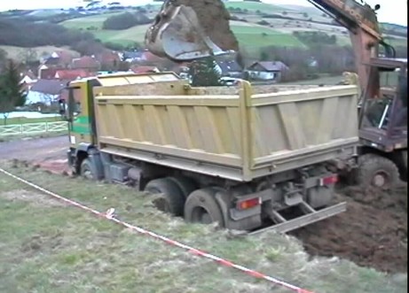 Etwas früher von der ´Schaff gemacht, kommen wir an der Baustelle an. Oops, so tief baggern die aus? Etwas Misstrauen über die Richtigkeit der Arbeiten machte sich breit. Nach ein paar Minuten kamen wir dann mit dem Fahrer ins Gespräch und nachdem wir ihm unsere Planung erklärt hatten, nickte er ab und versicherte uns, daß alles schon passen würde .... hoffentlich !