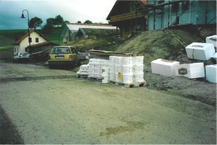 Als wir heute für "Vorbereitungsarbeiten" zum 1. Mai* an unsere Baustelle fuhren, um alle gefährdeten Dinge in Sicherheit zu bringen, und dafüreigentlich nur ein paar Minuten geplant hatten, stieg etwas Entsetzen hoch. Grund war, daß heute der Außenverputzer sein Arbeitsmaterial anliefern ließ. Die ganze Einfahrt war voll mit Styropor-Platten und 3 Paletten Farbeimern und anderen Dingen.
