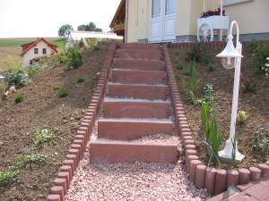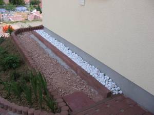 Auch der vergangene Urlaub ging (wie kann es anders sein) für Arbeiten am "Drumherum" drauf. Auf dem Programm stand u.a. die Verlegung von Bordsteinen in einem Streifen von 30cm rund um das Haus, die wir danach mit Marmorkies füllen wollten. Dies geschah nicht nur aus optischen Gründen, denn so fand der restliche Verschnitt an Steinen aus unserer Einfahrt auch eine letzte Ruhestätte ;-) Außerdem wollten wir uns, trotz erheblicher Zweifel, an die Treppe von der Straße zum Hauseingang machen. Wieder wurden uns die Tücken der Grundstücksauswahl am Hang bewusst, denn vieles ist doch wesentlich einfacher und preiswerter, wenn man ein ebenerdiges Grundstück sein Eigen nennen kann.
