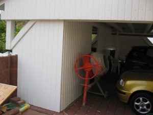 Dann wurde ein langersehnter Wunsch der Bauherrin erfüllt: Einen Schuppen zur Abtrennung einziehen, um den ganzen "Unrat" (Mülltonne, Rasenmäher usw.) verschwinden zu lassen. Motiviert ging man an´s Werk, die Ernüchterung kam nach nur wenigen Handgriffen, denn die Konstruktion an sich war keine großartige Herausforderung, aber das elendig, niemals endende Streichen der Nut- und Federbretter nahm doch wesentlich mehr Zeit in Anspruch, als veranschlagt. Trost spendete mir nur die Aussicht, daß der Urlaub ja schon nach zwei Wochen vorbei ist und man sich dann wieder erholen kann ;-)