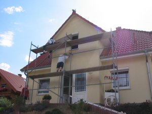 Und da noch nicht genug gestrichen rächte sich ein weiterer "Fehler": Als das Gerüst beim Bau noch stand, hatte ich keine Lust den Dachkasten zu streichen. Nach der Einsicht, daß dies mit einer Leiter um die 8.00m lang doch eher ein Himmelfahrtskommando werden könnte, kamen mir meine beiden Nachbarn Uwe und Thorsten zu Hilfe und bauten für ein Bierchen danach jeweils nach Fortschritt ein Gerüst auf - vielen Dank noch mal !
